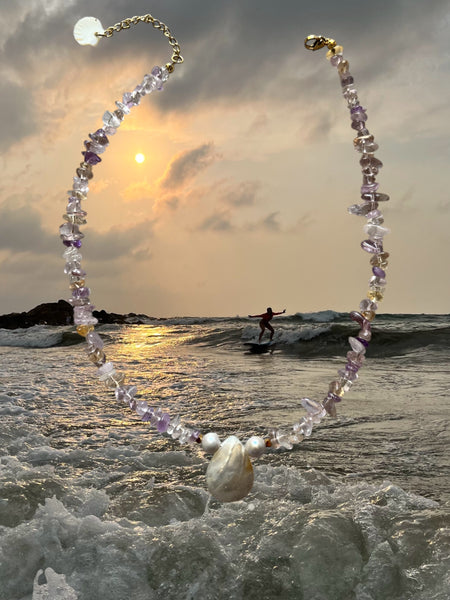 Collier de sirène en amétrine, avec une nacre coquillage en pendentif central.