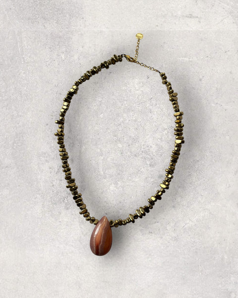 Un rang de graines d’hématies dorées polies et une goutte géante d’agathe abricot.